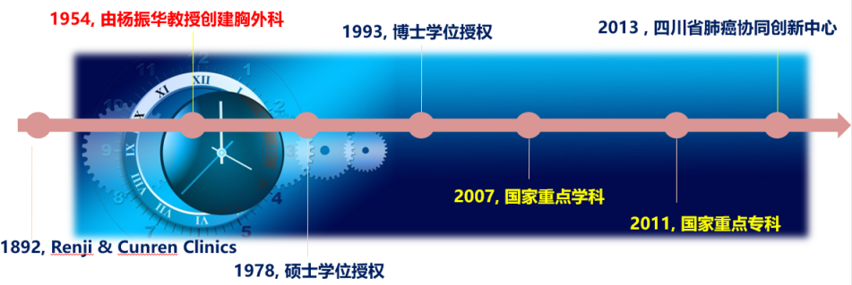 四川大学华西医院胸外科始建于1954年,由我国胸外科学奠基人之一、著名胸外科专家杨振华教授创立,是国内最早建立的胸心血管外科专业之一,目前是教育部“国家重点学科”和卫健委“国家临床重点专科建设项目”单位,是博士及硕士学位授权点、外科(胸心外科方向)住院医师规范化培训基地、胸外科专科医师培训基地。胸外科作为我院临床技能培训中心的主要参与单位,是美国外科医师协会(ACS)在亚洲地区的首家认证教育机构,举办的全国胸腔镜手术培训课程获英国皇家外科学院(RCS)认证。